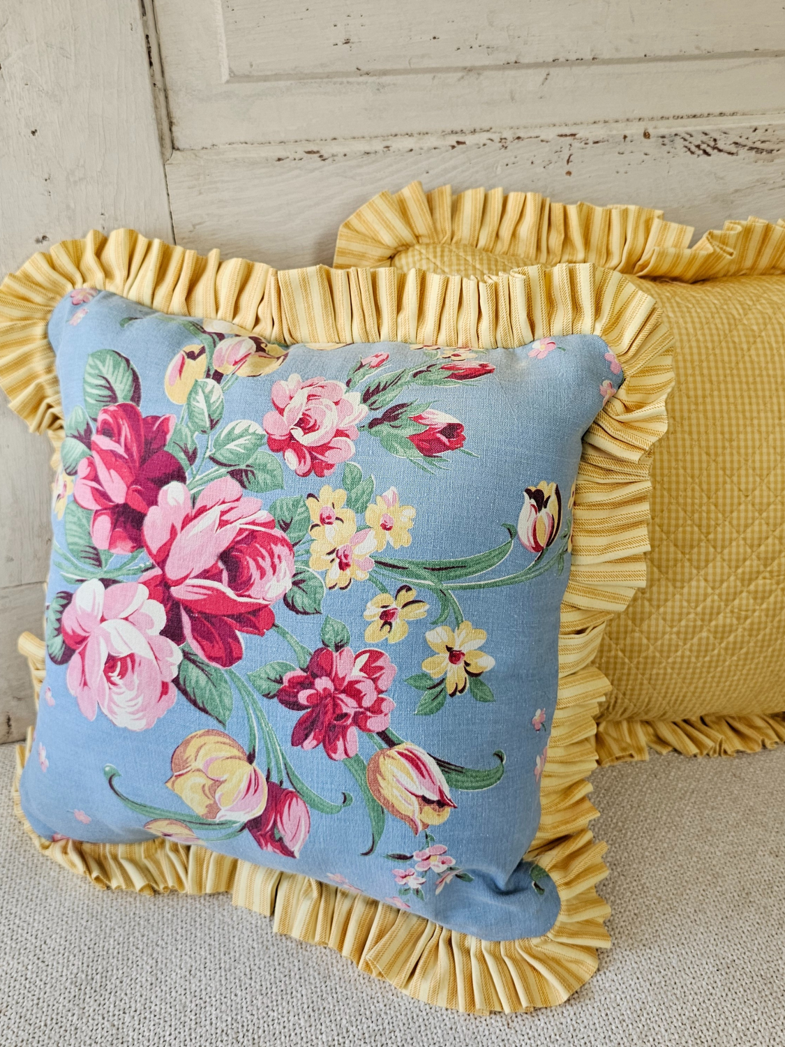 vintage cotton pillow accented with 1.5" pleated ruffles in a yellow stripe and backed with yellow checked quilt. Hand sewn closure