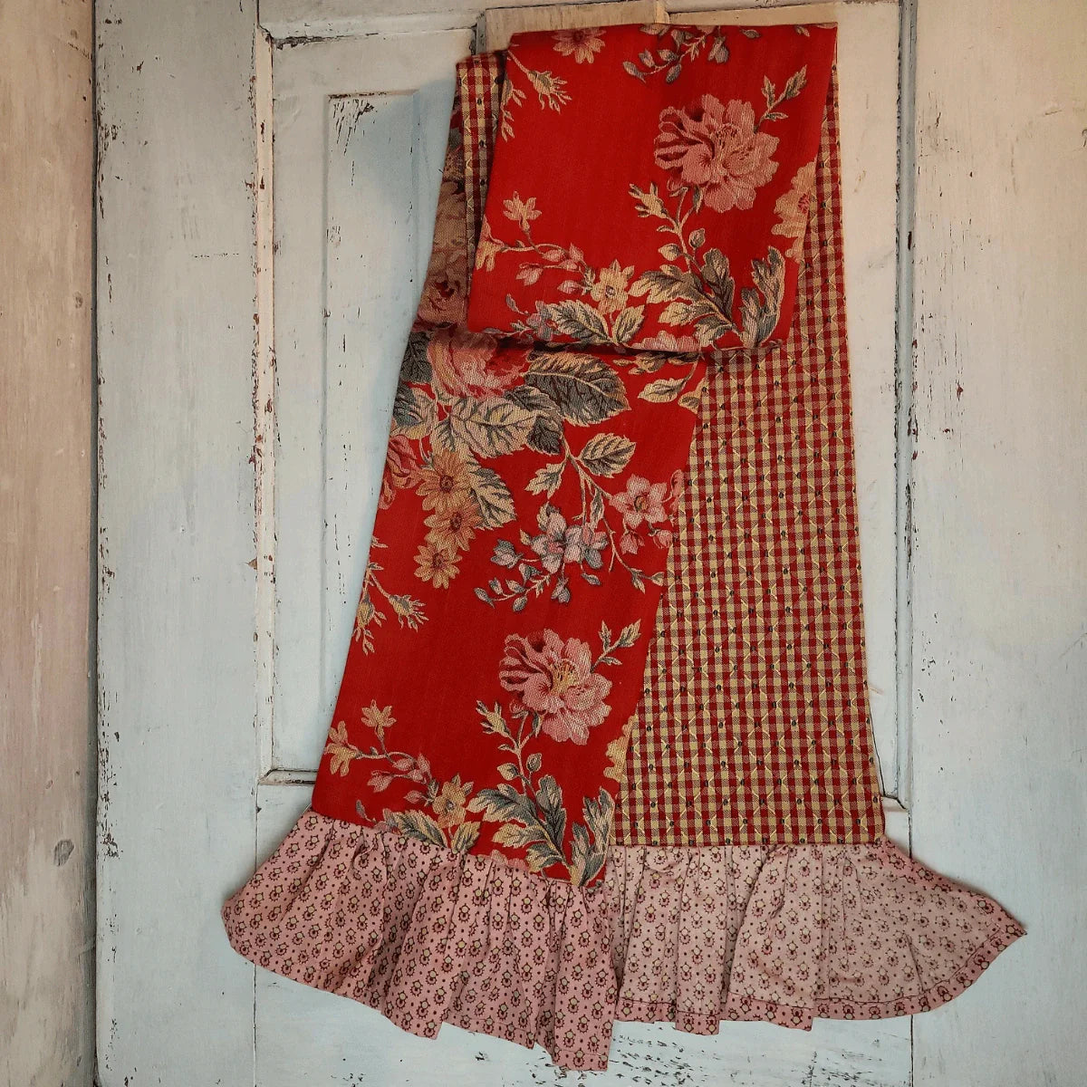 Accent runner out of a Red floral Ralph Lauren, edged with a complementing pink ruffle and lined in a quilted check.
