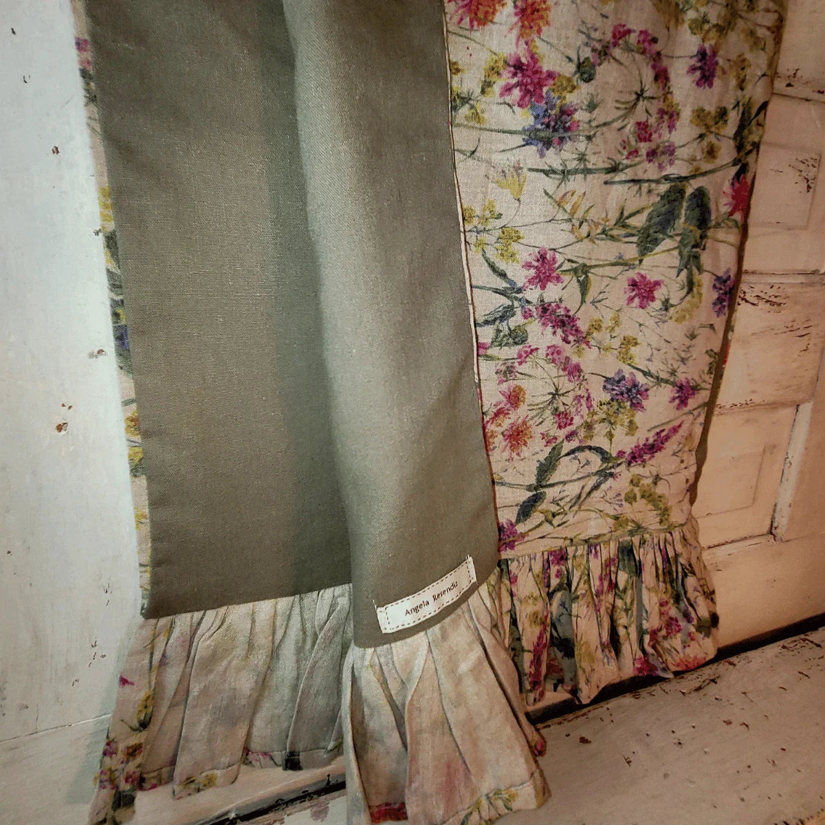 Light grey linen with wild flowers, lined with grey linen. Embellished with 5" ruffles.